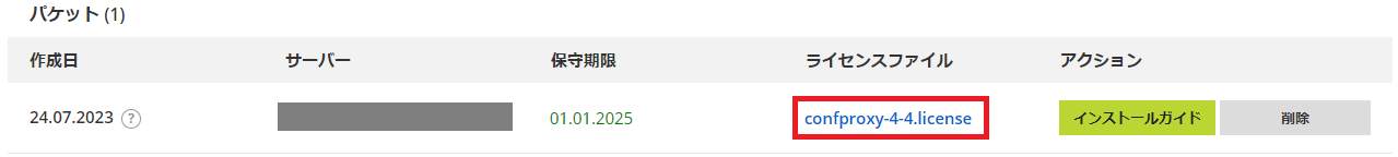 - 自動で「パケット」タブに移動します。3.で作成したサーバーの[confproxy-4-4.license]をクリックして、ライセンスファイル(confproxy-4-4.license)をダウンロードします。