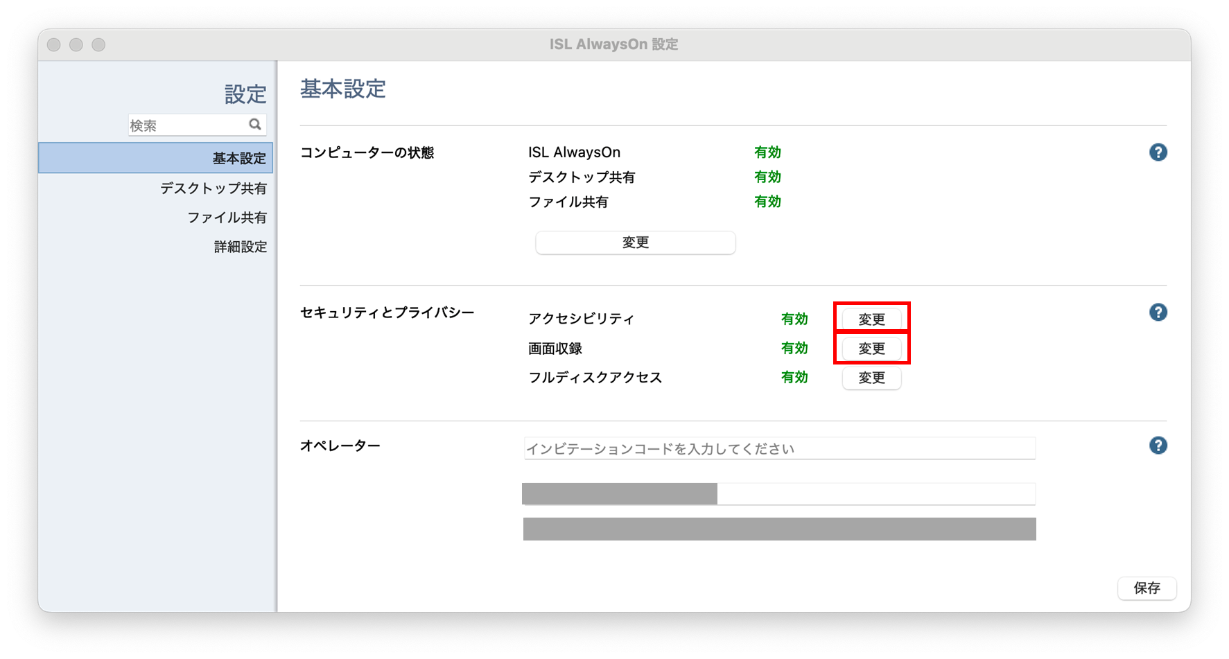 常駐接続を行うと黒い画面が表示される場合は、お手数ですが接続先のISL AlwasyOnの設定 - [基本設定] - [セキュリティとプライバシー]の、[アクセシビリティ]と[画面収録]の横の[変更]を押して、ISL製品を許可してください。